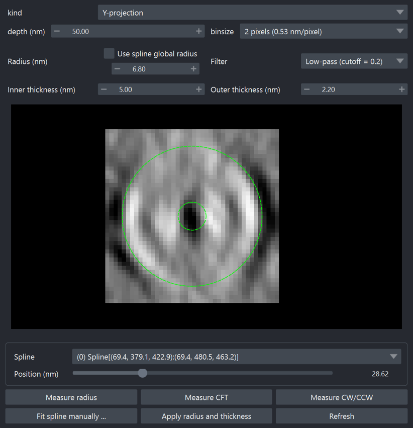 . Because the radius is not known yet, no image will be shown in the canvas. - Click the "Measure radius" button. This will automatically measure the radius the spline by detecting the peak of the radial profile around the spline. Cross-sectional slice will be shown in the canvas, based on the radius. If the measured value largely deviates from your expectation, you can manually adjust the "Radius (nm)" value in the GUI.